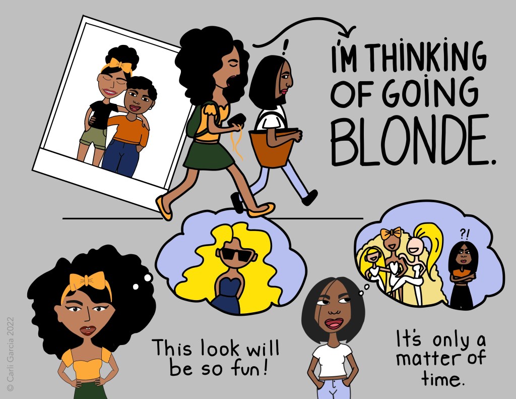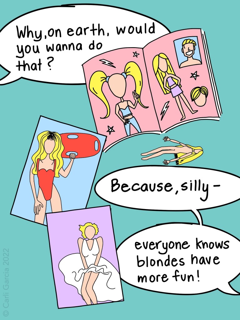 In August, I started SawGust with the Sequential Arts Workshop to document some of my adventures in as a graphic novel! The title of this story is “I’m Thinking of Going Blonde,” which is about the concept of “going blonde” as a person who isn’t born with corn-colored tresses and the impact it has on those who reach for the bleach. So far, it has been a lot of work juggling between ideas, learning to use Adobe Fresco, and a host of summer activities. Here is page one, which will probably end up being the “cover” when it’s finished. Thankful to the SAW Community for this group accountability activity!