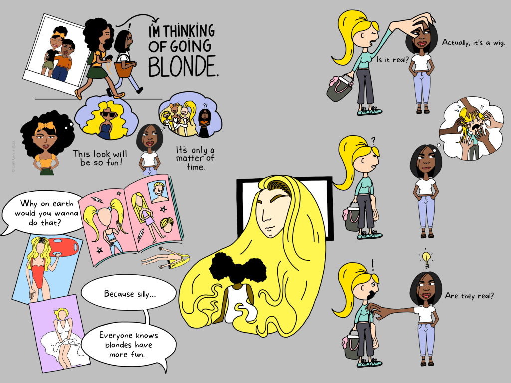 Here is the “original” vision that ties Hairica to “I’m Thinking of Going Blonde.” We have all been exposed to the image and concept of “blonde is better” for decades. Women (and men, but mostly women) have gone to great lengths to achieve “sun kissed” tresses given their manufactured association with beauty, femininity, and desirability.” ITOGB is an exploration of these ideas from the Black American, female perspective.